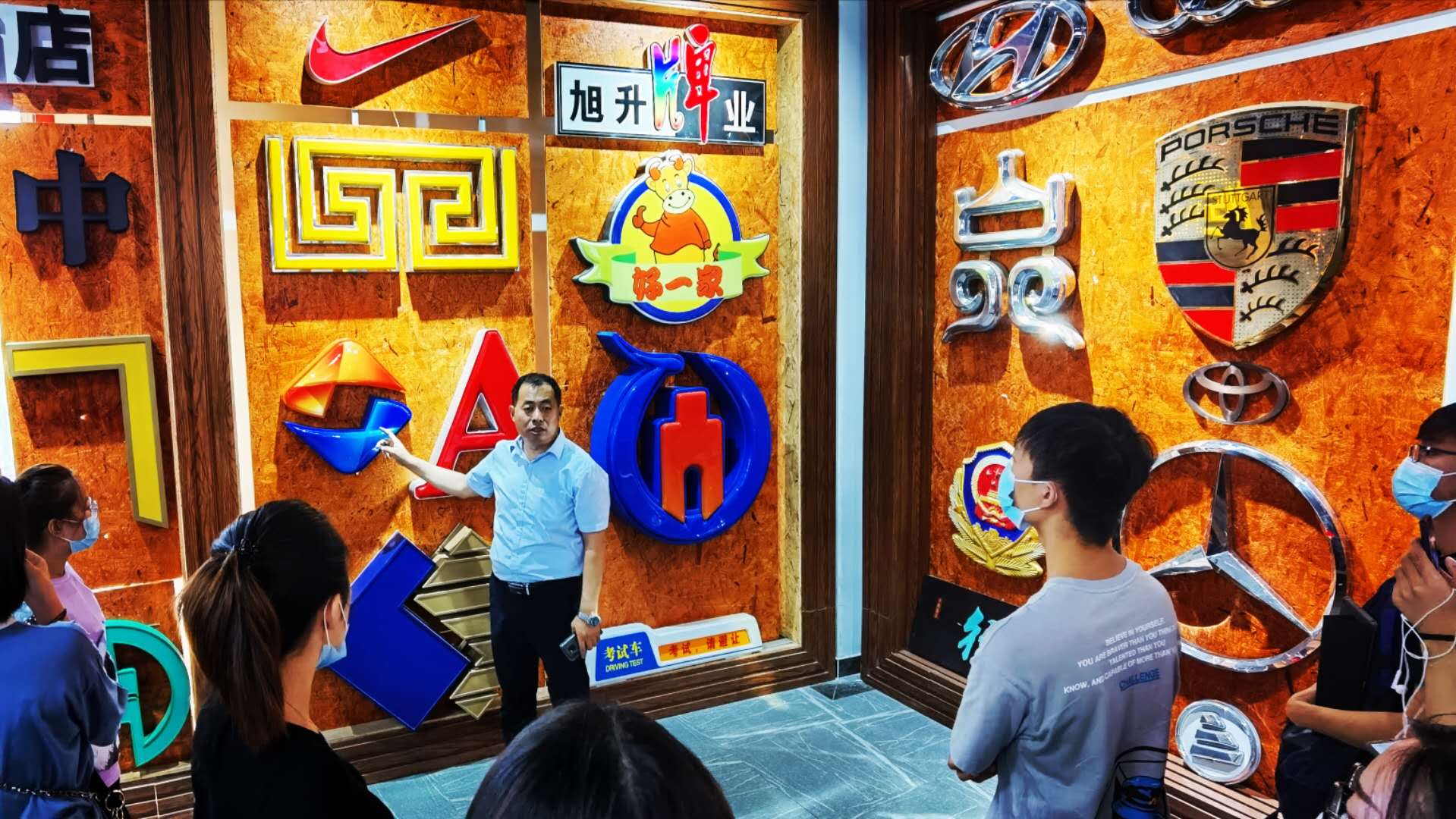 在实物展厅,苗总带领大家认识了各类不同形式的标识产品,并选取优秀案例分别从设计理念、材质工艺等方面进行了全方位的解读,帮助同学们从理论学习过渡到实践应用,更加全面和直观的了解标识产品的相关知识。