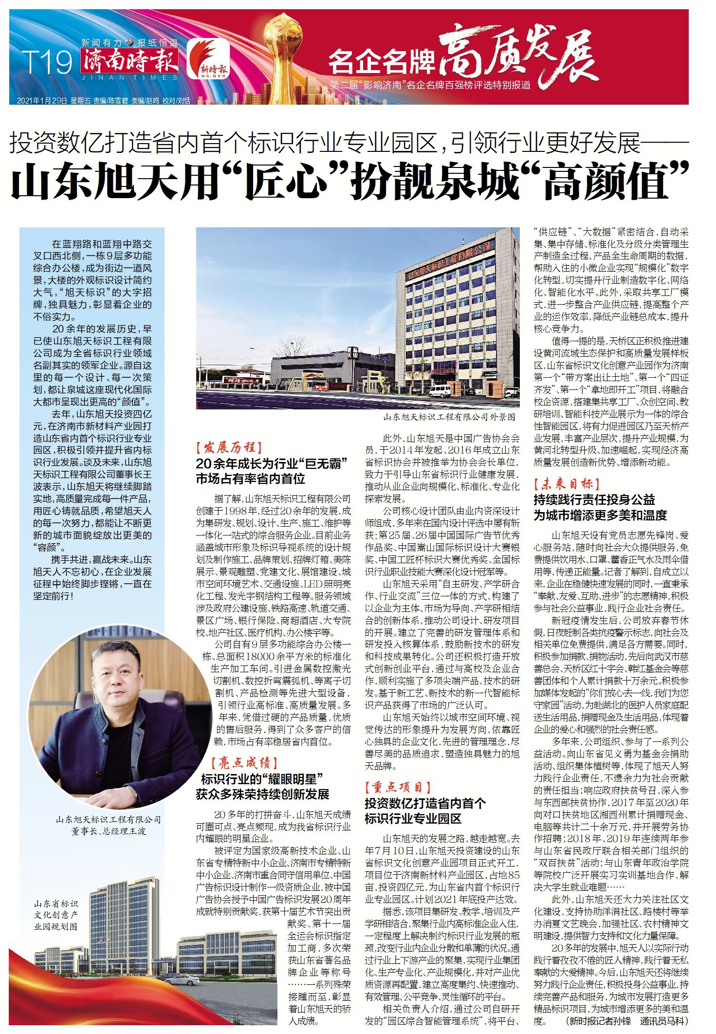 1月29日,第二届“影响济南”名企名牌百强榜评选特别报道—《投资数亿打造省内首个标识行业专业园区,引领行业更好发展—山东旭天用“匠心”扮靓泉城“高颜值”》在济南时报发表报道。