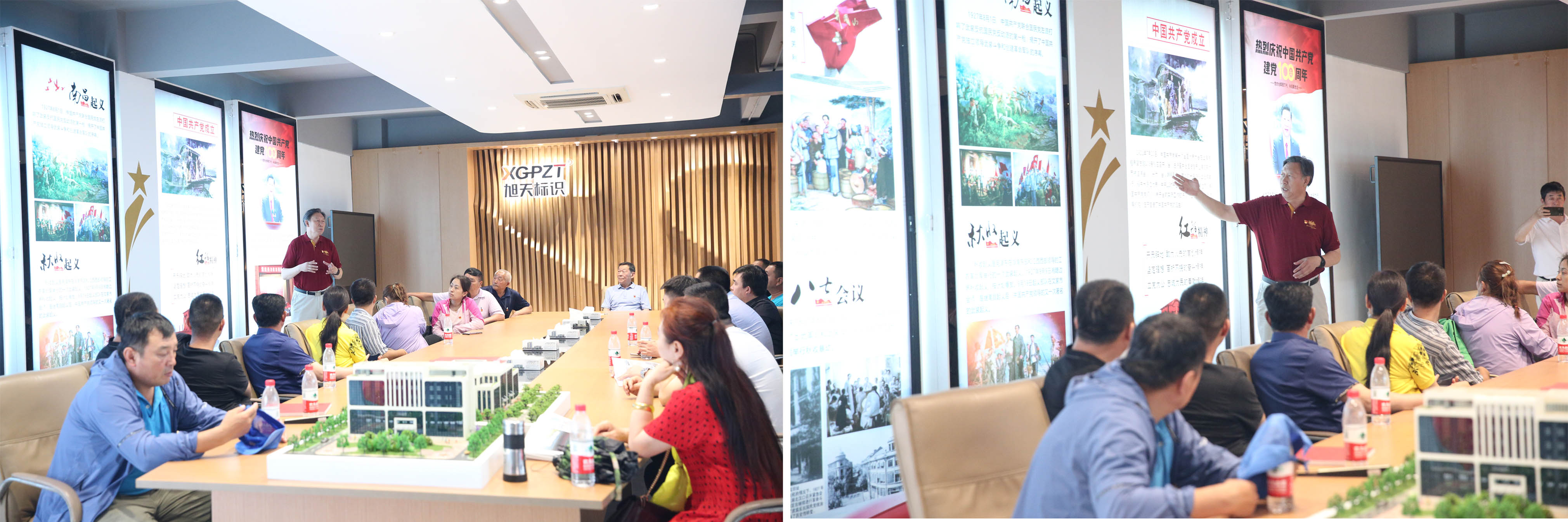 在公司董事长王波、党支部书记高久成的带领下,各位党员同志先后参观了旭天数字智慧展厅、标识实物展厅及党建教育示范基地,了解企业发展历程、企业文化的同时,对标识产品的种类及功能有了更深层次的认识和理解。