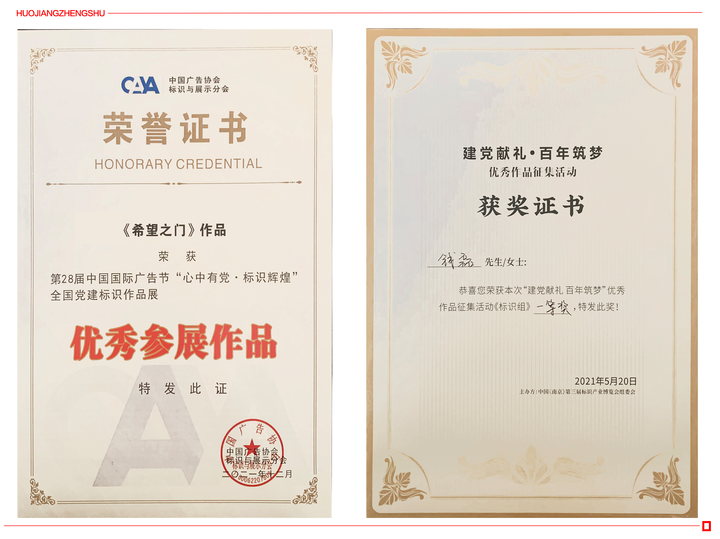 在2021年伟大的中国共产党建党百年之际由“建党献礼·百年筑梦”庆祝中国共产党建党100周年主题公益设计大赛组委会主办的“建党献礼·百年筑梦”党建主题公益设计大赛与中国广告协会·标识与展示分会发起的关于在第28届中国国际广告节举办“心中有党·标识辉煌”2021全国优秀党建标识作品汇展征集活动(本次展示具有公益性质不搞评比,对入选作品组委会颁发荣誉证书),相继开展。山东旭天作为山东省标识行业协会会长单位,积极参与并荣获“建党献礼 百年筑梦”优秀作品征集活动《标识组》一等奖及第28届中国国际广告节“心中有党·标识辉煌”全国党建标识作品展优秀参展作品。